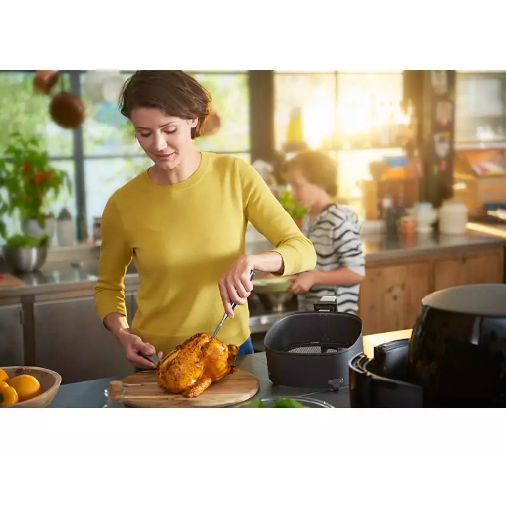 Với dung tích lớn XXL cho cả gia đình, nồi chiên có thể chứa cả gà nguyên con hoặc 1,4 kg khoai tây chiên